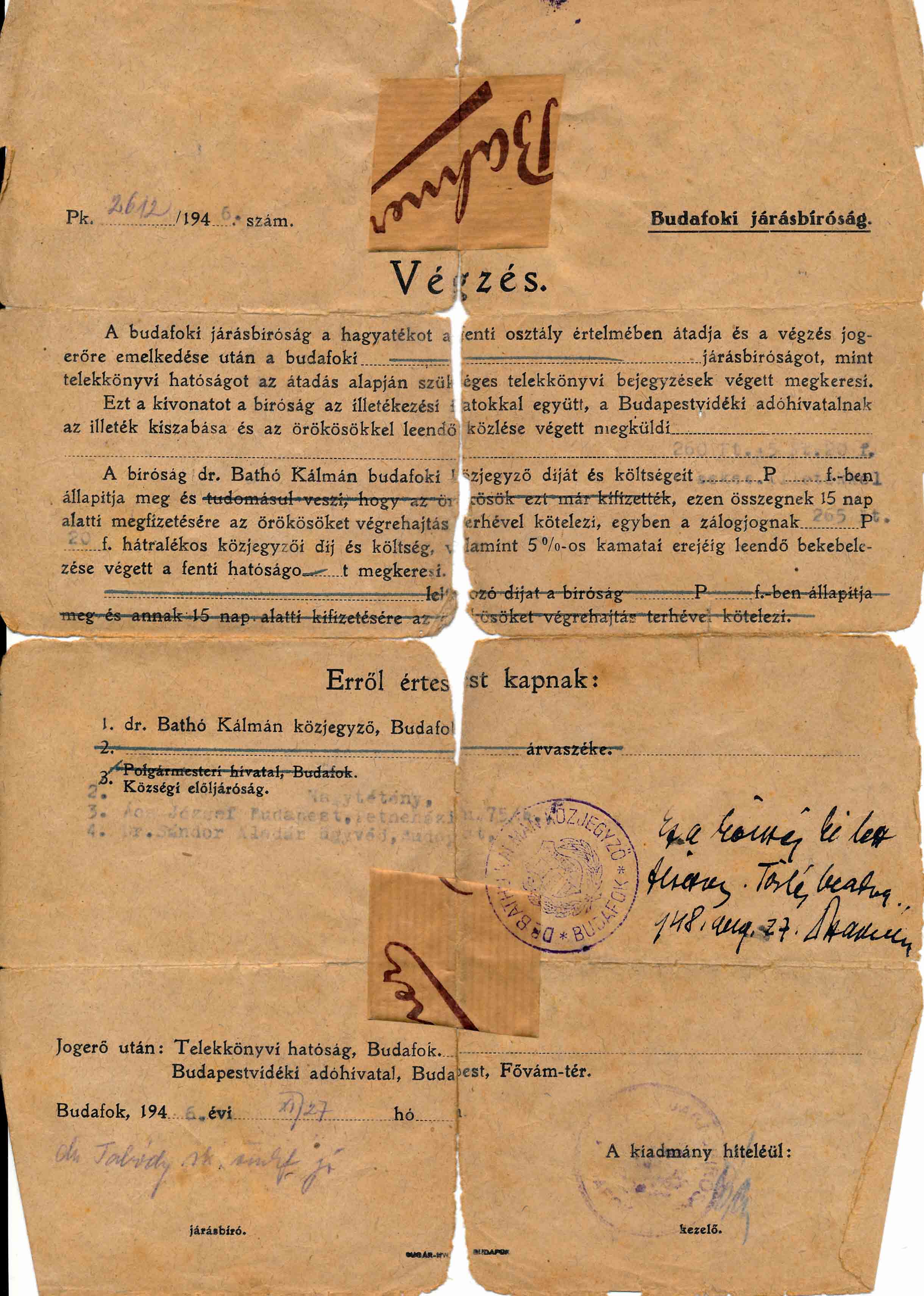 Ács Józsefné sz. Felföldi Mária Anna hagyatéki végzése.