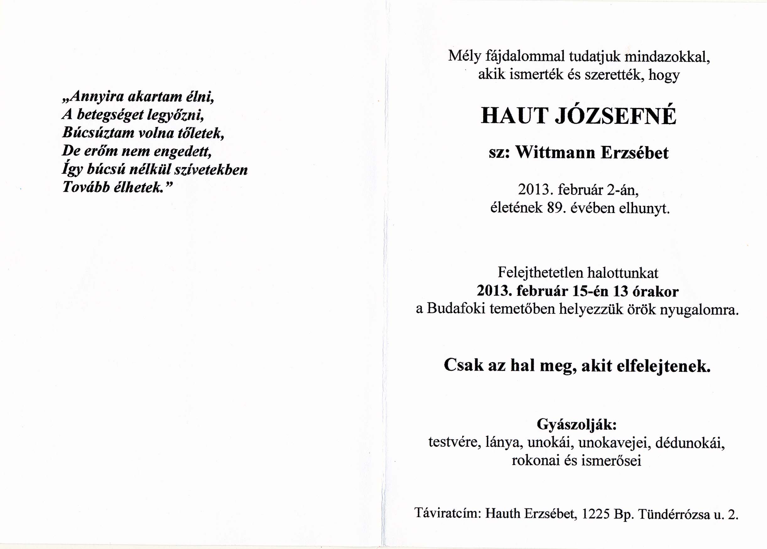 Haut Józsefné (született Wittmann Erzsébet) gyászjelentése |