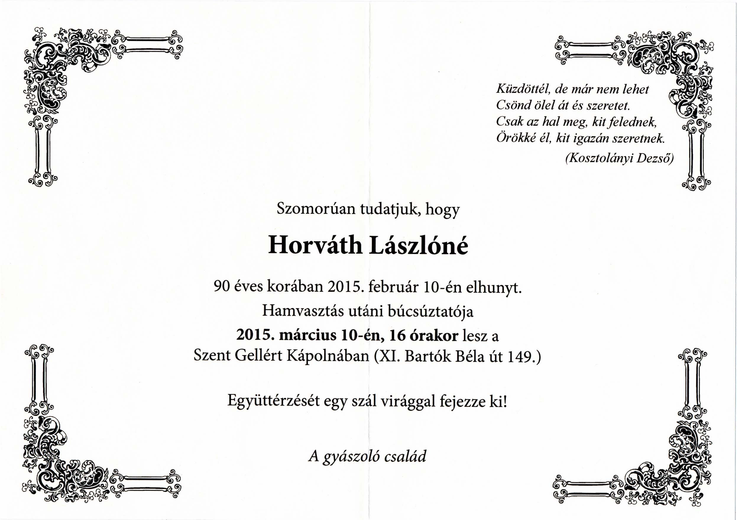 Horváth Lászlóné (született Cser Erzsébet) gyászjelentése